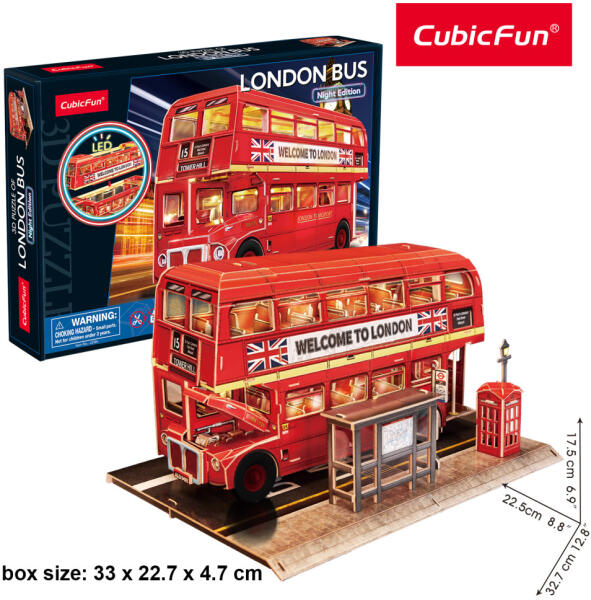 London egyik szimbóluma a piros emeletes busz. 172 db 3d puzzle elemből megépítheted. LED-es, világítós verzió, szoba dekorációnak nagyon látványos.
