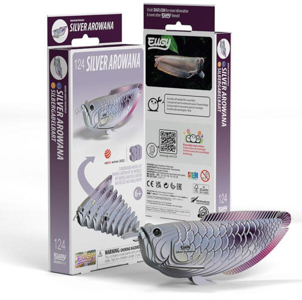 Építsd meg saját arawanádat, és engedd, hogy az Amazonas titokzatos világának egy darabkája költözzön hozzád! A karton darabok összeillesztésével fokozatosan rajzolódik ki ez a kecses, fényesen csillogó hal, amely minden szögből a folyók elegáns ragadozóit idézi. Az arawana Dél-Amerika trópusi folyóiban élő, ősi múltú halfaj. Testét nagy, ezüstösen csillogó pikkelyek borítják, és áramvonalas formája lehetővé teszi, hogy villámgyorsan csapjon le a felszínen úszó rovarokra és apró állatokra. Különlegessége a hosszú bajusz-szerű érzékszervpár, amely segíti a tájékozódásban és a zsákmány felkutatásában. Érdekesség, hogy akár másfél méteresre is megnőhet, és képes a vízfelszínből kiugorva zsákmányt szerezni a levelek közül. Az EUGY figura részletei – a hosszúkás test, a csillogó pikkelyek és a jellegzetes arcforma – mind hűen adják vissza az állat valódi karakterét. Az EUGY egy környezetbarát kartonból készült kreatív játék, amely könnyen újrahasznosítható. A mintákat környezetbarát festékkel nyomtatják, és a csomag biztonságos , mérgező anyagoktól mentes ragasztót tartalmaz. Az EUGY kollekcióban több mint 100 aranyos állatfigura közül választhatsz, és mindegyikhez érdekes tények tartoznak, amelyekből még többet megtudhatsz az adott állatról. Tökéletes ajándék gyerekeknek , állatrajongóknak és természetbarátoknak!
