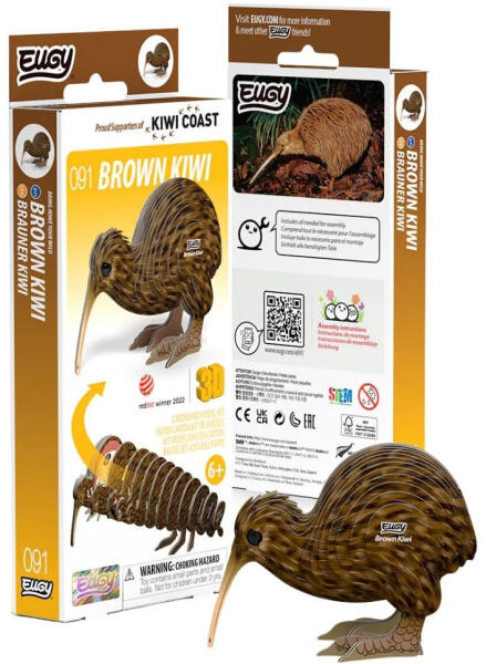 A Brown Kiwi EUGY modell tömzsi testével, hosszú csőrével és puha, tollas megjelenésével azonnal felismerhetővé teszi ezt a különleges, repülni nem tudó madarat. Az alkotás során életre kel a kivi egyedi bája – egy apró, de méltóságteljes lény, amely az új-zélandi természet szimbólumává vált. A barna kivi (Apteryx mantelli) éjszakai életmódot folytat, és hihetetlenül fejlett szaglása révén találja meg a föld alatti rovarokat. Bár nem tud repülni, hihetetlenül kitartó: gyorsan fut, és képes alkalmazkodni a környezetéhez. Az EUGY modell ezt a különleges természetet adja vissza – minden réteg a madár kíváncsiságát és életerejét idézi meg. Az EUGY egy környezetbarát kartonból készült kreatív játék , amely könnyen újrahasznosítható . A mintákat növényi alapú festékkel nyomtatják, és a csomag mérgező anyagoktól mentes ragasztót tartalmaz. Az EUGY kollekció több mint 100 kedves állatfigurát kínál, és mindhez érdekes háttérsztorik tartoznak. Tökéletes ajándék gyerekeknek, állatrajongóknak és természetkedvelőknek . Szerezd meg ezt a barátságos kis kivit , és engedd, hogy a természet derűs hangulata beköltözzön a polcodra!