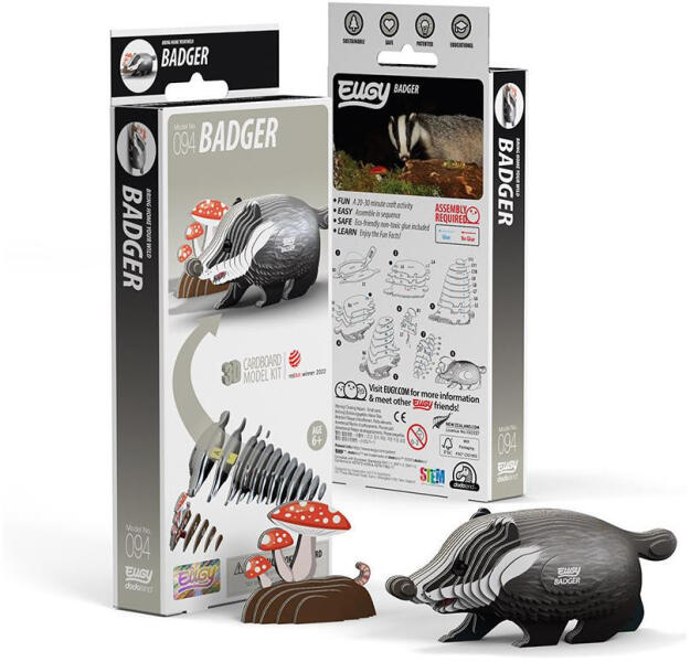 Fejleszd a kreativitásodat és türelmedet! Az EUGY nemcsak szórakoztató, hanem környezetbarát is. Ne hagyd ki a borzot! Ismerkedj meg a titokzatos és bájos borzzal! Egy igazán egyedi, éjjeli életet élő kis állat, aki mindig meglep téged! Az EUGY egy környezetbarát kartonból készült kreatív játék, amely könnyen újrahasznosítható. A mintákat környezetbarát festékkel nyomtatják, és a csomagban biztonságos, mérgező anyagoktól mentes ragasztó található. Teljesen gyerekbarát és kíméli a természetet! Az EUGY kollekcióban több mint 100 aranyos állatfigura közül választhatsz! Minden modellhez érdekes tények is tartoznak, amelyekből még többet megtudhatsz az adott állatról. Tökéletes ajándék gyerekeknek és állatrajongóknak, ráadásul egy környezetbarát gyűjthető sorozat első darabja is lehet! A borz titokzatos kis éjjeli lény, aki leginkább rejtett életmódjáról híres. Ez az állat az erdők és rétek titkos lakója, aki főként éjjel aktív. A borzok elbűvölő külsejükkel és ügyes mozgásukkal könnyen rabul ejtik a szíveket. Jellemző rájuk a csíkos hát és a kis, szomorú szemek, de valójában egy rendkívül szívós és talpraesett állatról van szó. A EUGY Borz 3D puzzle nemcsak a borzok titokzatos világába vezet el, hanem lehetőséget ad arra is, hogy saját magad építhesd meg ezt az aranyos kis állatot. A részletes tervezés és az ügyes kidolgozás biztosítja, hogy minden alkotó élvezettel építse meg a borzot, miközben egy szórakoztató és kreatív időtöltést kínál. Ne hagyd ki! Építsd meg saját borzodat, és tedd egyedivé a saját állatgyűjteményedet!