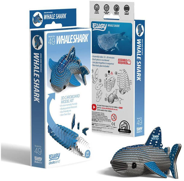 Fejleszd a kézügyességed! Az EUGY nemcsak kreativitásra ösztönöz, hanem környezetbarát is. Merülj el a tenger mélyén! Rakd ki a cetcápát , és merülj el a tenger hatalmas világában! Ez a különleges 3D puzzle egy igazi tengeri kalandot hoz el a szobádba. Az EUGY egy környezetbarát kartonból készült kreatív játék, amely könnyen újrahasznosítható. A mintákat környezetbarát festékkel nyomtatják, és a csomagban biztonságos , mérgező anyagoktól mentes ragasztó található. Teljesen gyerekbarát és kíméli a természetet! Az EUGY kollekcióban több mint 100 aranyos állatfigura közül választhatsz! Minden modellhez érdekes tény is tartozik, amelyekből még többet megtudhatsz az adott állatról. Tökéletes ajándék gyerekeknek és állatrajongóknak, ráadásul egy környezetbarát gyűjthető sorozat első darabja is lehet! A cetcápa az óceánok egyik legnagyobb hala, és hihetetlenül nagy méretével lenyűgözi az embereket. Bár a cetcápák nem veszélyesek az emberekre, ezek az óriások hatalmas szájukkal és hatékony úszásukkal mindig lenyűgözik a tengeri élet iránt érdeklődőket. Szerezd be a cetcápa 3D puzzle-t, fedezd fel a tenger legnagyobb titkait!