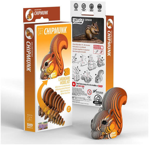Az EUGY nemcsak a kreativitást serkenti, hanem környezetbarát is. Fejleszd a kézügyességed, miközben megismerkedsz a természet egyik aranyos képviselőjével! Rakd ki a Csíkos Mókust , hozd el az erdő szórakoztató lakóját a szobádba ezzel a különleges 3D puzzle-lal! Az EUGY egy környezetbarát kartonból készült kreatív játék, amely könnyen újrahasznosítható. A mintákat környezetbarát festékkel nyomtatják, és a csomagban biztonságos , mérgező anyagoktól mentes ragasztó található. Az EUGY kollekcióban több mint 100 aranyos állatfigura közül választhatsz, mindegyikhez érdekes tények is tartoznak, amelyek segítenek még többet megtudni az adott állatról. Tökéletes ajándék gyerekeknek és állatrajongóknak, ráadásul egy környezetbarát gyűjthető sorozat első darabja is lehet! A Csíkos Mókus egy apró, de rendkívül gyors állat, mely az erdők és parkok kedvelt lakója. A jellegzetes csíkos bundájáról ismert, és ügyességéről, gyors mozdulatairól híres, amellyel könnyedén mászik fákon és szerzi be élelmét, mint a mogyorót, diót vagy gyümölcsöket. Ezen kívül híres arról is, hogy előszeretettel rak el téli készleteket, hiszen rendkívül szorgalmas és okos állat. Fun fact: a mókusok emlékeznek arra, hogy hova rejtették el az élelmet, így télen is biztosítják maguknak a táplálékot, miközben az erdő egyik legjobban megfigyelt és leginkább szeretett állatai. Szerezd be a Csíkos Mókus 3D puzzle-t, alkosd meg ezt az ügyes, energikus kis állatot, miközben élvezed a kreativitás örömét!