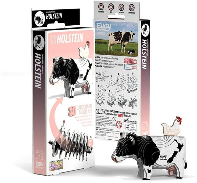 A Holstein-fríz tehén a világ legismertebb tejtermelő fajtája, jellegzetes fekete-fehér színű bundájával. A mezőgazdaságban fontos szerepet játszik, és a vidéki tájak ikonikus alakja. Fejleszd a kézügyességed a EUGY Holstein-fríz tehén 3D puzzle segítségével! Az újrahasznosított kartonból készült, számozott darabokból építheted meg saját tehénfigurádat, miközben a kreativitásodat is ösztönzöd. Az EUGY egy környezetbarát márka, amely nemcsak a szórakozást, hanem a fenntarthatóságot is előtérbe helyezi. Ne habozz, hozd haza saját tehenedet! Hozd el a farm varázsát, és építsd meg saját Holstein-fríz tehénfigurádat! Az EUGY egy környezetbarát kartonból készült kreatív játék, amely könnyen újrahasznosítható. A mintákat környezetbarát festékkel nyomtatják, és a csomagban biztonságos, mérgező anyagoktól mentes ragasztó található. Teljesen gyerekbarát és kíméli a természetet! Az EUGY kollekcióban több mint 100 aranyos állatfigura közül választhatsz! Minden modellhez érdekes tények is tartoznak, amelyekből még többet megtudhatsz az adott állatról. Tökéletes ajándék gyerekeknek és állatrajongóknak, ráadásul egy környezetbarát gyűjthető sorozat első darabja is lehet! A Holstein-fríz tehén az egyik legismertebb és legelterjedtebb tejhasznú tehénfajta a világon, különösen híres a fekete-fehér foltos bundájáról. A Holstein-fríz tehén nagy méretével és kiváló tejtermelési képességeivel híres. A tejipar egyik alapvető szereplője, amely nap mint nap segít táplálni a világot a friss tejével. Barátságos, szelíd természetűek, és a gazdaságok fontos tagjai. A 3D puzzle segítségével most saját magad építheted meg a kedves Holstein-fríz tehenet, miközben jobban megismerheted ezt a hasznos és csodálatos állatot. Építés közben szórakozva tanulhatsz a tehénfajtáról, és elmélyítheted tudásodat az állattenyésztés világában. Ne hagyd ki a lehetőséget – építsd meg a saját Holstein-fríz tehened, és hozd el a farm varázsát otthonodba!