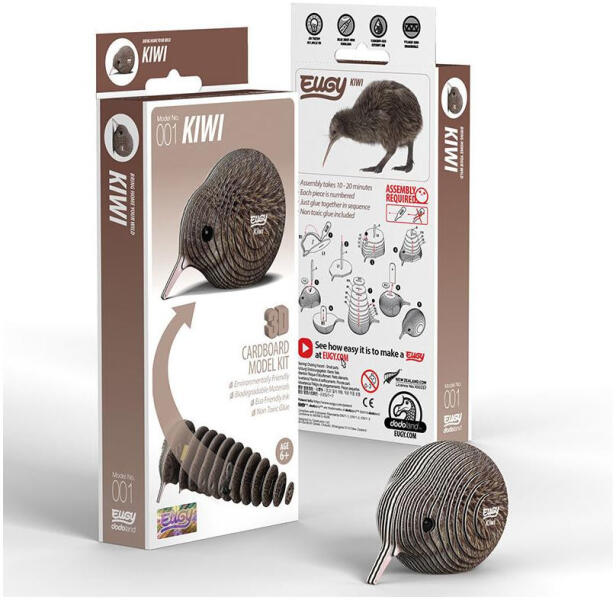 A kivi egy titokzatos, éjszakai életmódot folytató madár Új-Zélandról. Fejleszd kreativitásodat, miközben megalkotod ezt az egyedi madarat ezzel a 3D puzzle-lal! Az EUGY újrahasznosított kartonból készült, számozott elemekkel. Rakd ki a Kivit , hozd el a szobádba Új-Zéland titokzatos nemzeti madarát egy különleges 3D puzzle formájában! Az EUGY egy környezetbarát kartonból készült kreatív játék, amely könnyen újrahasznosítható. A mintákat környezetbarát festékkel nyomtatják, és a csomag biztonságos, mérgező anyagoktól mentes ragasztót tartalmaz. Az EUGY kollekcióban több mint 100 aranyos állatfigura közül választhatsz, és mindegyikhez érdekes tények tartoznak, amelyekből még többet megtudhatsz az adott állatról. Tökéletes ajándék gyerekeknek , állatrajongóknak és természetbarátoknak! A kivi , az Új-Zéland nemzeti madara, rendkívül különleges, hiszen szárnyai annyira kicsik, hogy nem tud repülni. Azonban kiválóan alkalmazkodott a földi élethez, egyedülállóan hosszú csőrével képes rovarokat keresni a föld alatt. A kivi tojásai rendkívül nagyok, és az anyamadár mindent megtesz a védelmük érdekében, egyedülálló módon a tojások számára kijelölt helyeken őrködik. Éjszakai életmódja és földalatti élete teszik őt igazán különlegessé. Szerezd be a kivi 3D puzzle-t, rakd ki ezt az egyedülálló madarat!