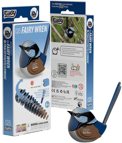 A Fairy Wren EUGY modell élénk kékeszöld tollakkal, karcsú testtel és kecses mivoltával ragadja meg ezt a kis madárszerű csodát. A tollazat finom mintái, a testforma és a lendület mind azt sugallják, hogy a figura mindig arra vár, hogy mozogjon. A lazúr tündérmadár (Malurus sp. ) Ausztrália és Új-Guinea vidékein él, és híres élénk színéről, páros viselkedéséről és gyors mozgásáról. Hangja vidám, mozdulatai fürgék — az EUGY modell ezt a játékosságot hozza el apró méretben, de nagy karakterrel. Az EUGY egy környezetbarát kartonból készült kreatív játék , amely könnyen újrahasznosítható . A mintákat növényi alapú festékkel nyomtatják, és a csomag mérgező anyagoktól mentes ragasztót tartalmaz. Az EUGY kollekció több mint 100 aranyos állatfigura közül válogathatsz, és mindegyikhez érdekes tények tartoznak. Tökéletes ajándék gyerekeknek, állatrajongóknak és természetbarátoknak . Tedd a tiéd ezt a kis tündérmadarat , és engedd, hogy a ragyogó színek meséje beköltözzön a gyűjteményedbe!
