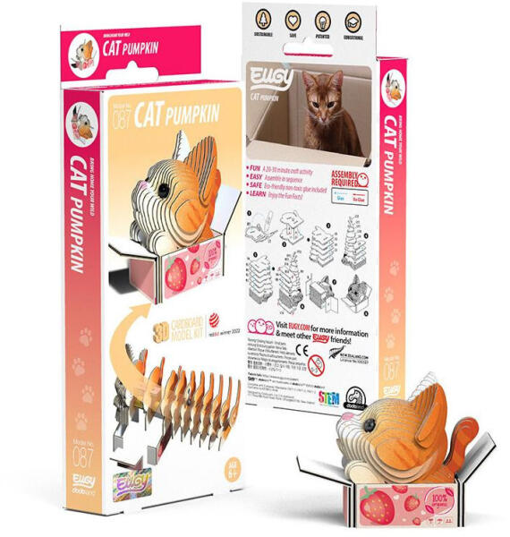 A Pumpkin macska igazi őszi varázslatot hoz a világodba! Játékos természetével és élénk narancssárga bundájával a legjobb társ a hideg hónapokban. A macskák függetlenek, mégis mindig ott vannak, hogy szórakoztassanak és szeretetet adjanak. Fejleszd a kézügyességedet, és építsd meg saját EUGY Pumpkin Macskádat ! Az újrahasznosított kartonból készült puzzle darabok segítségével egy bájos, őszies hangulatú macska formálódik. Az EUGY nemcsak a kreativitást ösztönzi, hanem környezetbarát módon szórakoztat is. Ne hagyd ki, tartsd a Pumpkin macskát a szobádban, és hozd el a tavaszi frissességét! Ismerkedj meg Pumpkin-nel! A játékos, energikus kis cicával, aki mindig készen áll egy mókás kalandra! Az EUGY egy környezetbarát kartonból készült kreatív játék, amely könnyen újrahasznosítható. A mintákat környezetbarát festékkel nyomtatják, és a csomagban biztonságos, mérgező anyagoktól mentes ragasztó található. Teljesen gyerekbarát és kíméli a természetet! Az EUGY kollekcióban több mint 100 aranyos állatfigura közül választhatsz! Minden modellhez érdekes tények is tartoznak, amelyekből még többet megtudhatsz az adott állatról. Tökéletes ajándék gyerekeknek és állatrajongóknak, ráadásul egy környezetbarát gyűjthető sorozat első darabja is lehet! Pumpkin egy igazi kis ördög, aki mindig vidám és tele van energiával! Ez a bájos cica szeret minden pillanatot kihasználni a játékra és mókázásra. Az ősz színeiben pompázó, különleges kinézetével garantáltan mosolyt csal mindenki arcára. Pumpkin nemcsak egy cuki cica, hanem igazi társ, aki mindig készen áll arra, hogy elrabolja a szívedet. Építsd meg saját Pumpkin cicádat az EUGY 3D puzzle segítségével, és hozd el a vidámságot otthonodba. A puha, őszi árnyalatokkal és a játékos hangulattal Pumpkin egy tökéletes ajándék lesz minden cicakedvelő számára, és egy izgalmas alkotási élményt kínál, miközben felfedezed a macskák világát. Ne hagyd ki! Építsd meg a saját Pumpkin cicádat, és hozd el a tavasz frissességét és a vidámságot!