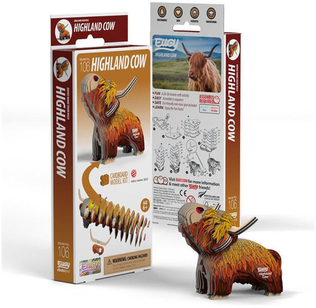 A skót-felföldi marha, e híres és szimbolikus állat, most egy 3D puzzle formájában valósul meg. A szőrös, masszív test és a jellegzetes hosszú szarvak a játékban is megjelennek! Rakd össze ezt az impozáns marhát, és hozd el a skót tájak egy darabját a szobádba! Építsd meg saját skót-felföldi marhádat, és fedezd fel ennek az erős és büszke fajtának a világát!" Az EUGY egy környezetbarát kartonból készült kreatív játék, amely könnyen újrahasznosítható. A mintákat környezetbarát festékkel nyomtatják, és a csomagban biztonságos, mérgező anyagoktól mentes ragasztó található. Teljesen gyerekbarát és kíméli a természetet! Az EUGY kollekcióban több mint 100 aranyos állatfigura közül választhatsz! Minden modellhez érdekes tények is tartoznak, amelyekből még többet megtudhatsz az adott állatról. Tökéletes ajándék gyerekeknek és állatrajongóknak, ráadásul egy környezetbarát gyűjthető sorozat első darabja is lehet! A skót-felföldi marha egy lenyűgöző és erős állat, amelyet a skót hegyek vidékén tenyésztenek. Jellemző rá a hosszú, dús szőr, amely nemcsak a hideg hegyvidéki időjárásnak segít ellenállni, hanem különleges, büszke megjelenést is ad neki. A felföldi marhák barátságosak, de rendkívül szívósak, és képesek túlélni a legzordabb körülmények között is. A skót-felföldi marha világszerte híres a húsáért és kemény munkabírásáért. A EUGY Skót-felföldi marha 3D puzzle segítségével most megépítheted saját skót-felföldi marhádat! Az építési folyamat során megismerkedhetsz ezzel a csodálatos állattal, miközben kreatívan alkothatod meg a részletes és gyönyörű szőrzetet és testet. Ne hagyd ki! Építsd meg saját skót-felföldi marhádat, és hozd el a vidéki élet hangulatát otthonodba!