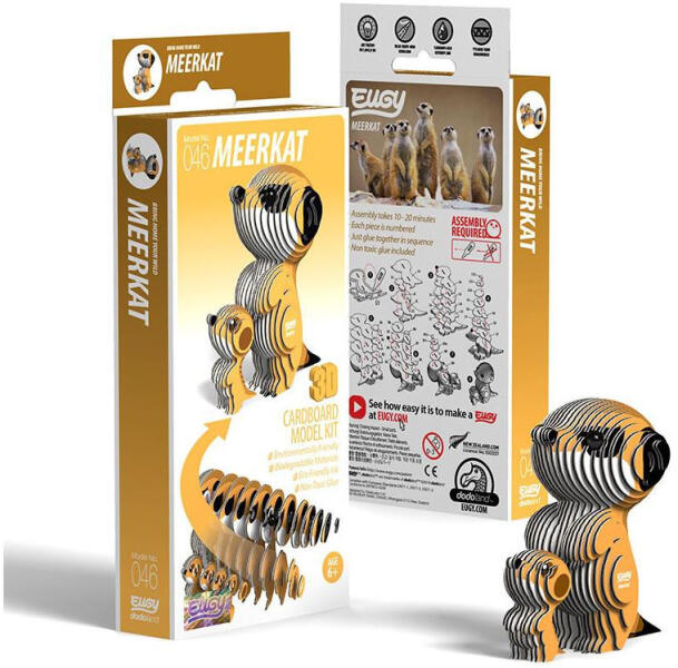 Fejleszd a kézügyességed! Az EUGY nemcsak kreativitásra ösztönöz, hanem környezetbarát is. Tedd otthonodba a szurikáták szórakoztató világát!Rakd ki a szurikátát , és élvezd a szórakoztató sivatagi világot! Ez a kis, de rendkívül aktív 3D puzzle minden korosztálynak izgalmas kihívást kínál. Az EUGY egy környezetbarát kartonból készült kreatív játék, amely könnyen újrahasznosítható. A mintákat környezetbarát festékkel nyomtatják, és a csomagban biztonságos, mérgező anyagoktól mentes ragasztó található. Teljesen gyerekbarát és kíméli a természetet! Az EUGY kollekcióban több mint 100 aranyos állatfigura közül választhatsz! Minden modellhez érdekes tény is tartozik, amelyekből még többet megtudhatsz az adott állatról. Tökéletes ajándék gyerekeknek és állatrajongóknak, ráadásul egy környezetbarát gyűjthető sorozat első darabja is lehet! A szurikáták a sivatagokban és száraz füves területeken élnek. Ezek a szórakoztató, szociális állatok mindig vigyáznak egymásra, és ha veszélyt észlelnek, mindegyikük feláll és figyelmeztet a közeledő veszedelemre. A szurikáták nagyon barátságosak és társas lények, akik mindig figyelnek a közösségi életükre. Szerezd be a szurikáta 3D puzzle-t, és tedd színesebbé a napod a sivatag életének csodáival!