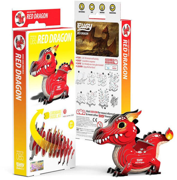 A vörös sárkány a mitológiai világ egyik legismertebb és legfélelmetesebb lénye, amely hatalmas szárnyaival és tűzokádó erejével sok mesében szerepel. Erős, bátor és titokzatos, egy igazi legendás teremtmény, amely mindig lenyűgözi az embereket. Fejleszd a kézügyességedet, és építsd meg saját EUGY Vörös Sárkányodat ! A kartonból készült, számozott puzzle darabok segítségével egy egyedülálló sárkányfigurát alkothatsz. Az EUGY nemcsak a kreativitást ösztönzi, hanem környezetbarát is, így élvezheted a szórakozást fenntartható módon. Ne habozz, hozd el a varázslatot a saját otthonodba! Szabadítsd el a fantáziádat, és építsd meg a saját Vörös Sárkányodat! Az EUGY egy környezetbarát kartonból készült kreatív játék, amely könnyen újrahasznosítható. A mintákat környezetbarát festékkel nyomtatják, és a csomagban biztonságos, mérgező anyagoktól mentes ragasztó található. Teljesen gyerekbarát és kíméli a természetet! Az EUGY kollekcióban több mint 100 aranyos állatfigura és karakter közül választhatsz! Minden modellhez érdekes tények is tartoznak, amelyekből még többet megtudhatsz az adott figuráról. Tökéletes ajándék gyerekeknek és fantasy rajongóknak, ráadásul egy környezetbarát gyűjthető sorozat első darabja is lehet! A Vörös Sárkány a mitológiák és mesék egyik legfélelmetesebb és legcsodálatosabb lényeként ismert. A tűzokádó sárkányok gyakran az erő és a hatalom szimbólumai, amelyek a bátorság és a veszélyes kalandok világába vezetnek. A vörös szín az erőt, a szenvedélyt és a harcot jelképezi, így a Vörös Sárkány nemcsak egy mesebeli lény, hanem egy igazi hős is lehet egy történetben. A 3D puzzle segítségével most te is megalkothatod a saját sárkányodat, miközben belemerülsz a fantasy világába. Építés közben megismerheted a sárkányokkal kapcsolatos izgalmas legendákat és történeteket. Ne hagyd ki ezt a különleges lehetőséget – építsd meg a saját Vörös Sárkányodat, és szabadítsd el a fantáziádat!