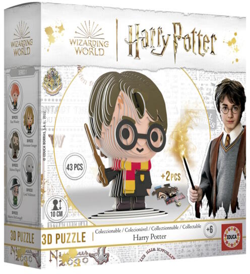 Az Educa újdonsága, a 3D Mini figura puzzle új, mégis klasszikus koncepciót képvisel. A kirakó segítségével látványos, 3 dimenziós Harry Potter karaktereket készíthetsz el. A kemény kartonból készült darabokat a megfelelő sorrendben kell összeilleszteni, melyekhez ragasztó sem kell. Az elkészült Harry Potter modell részletgazdag,  kb. 10 cm magas alkotás. A doboz tartalmaz egy útmutatót az összerakáshoz, valamint 2 db kirakó darabkát, mely egy exkluzív, 12 darabos Harry Potter puzzle részét képezik. Gyűjtsd össze mind a 6 karaktert ( Harry Potter, Ron, Hermione, Voldemort, Hagrid és McGalagony ) és szerezd meg az összes darabkát a puzzle kirakásához!