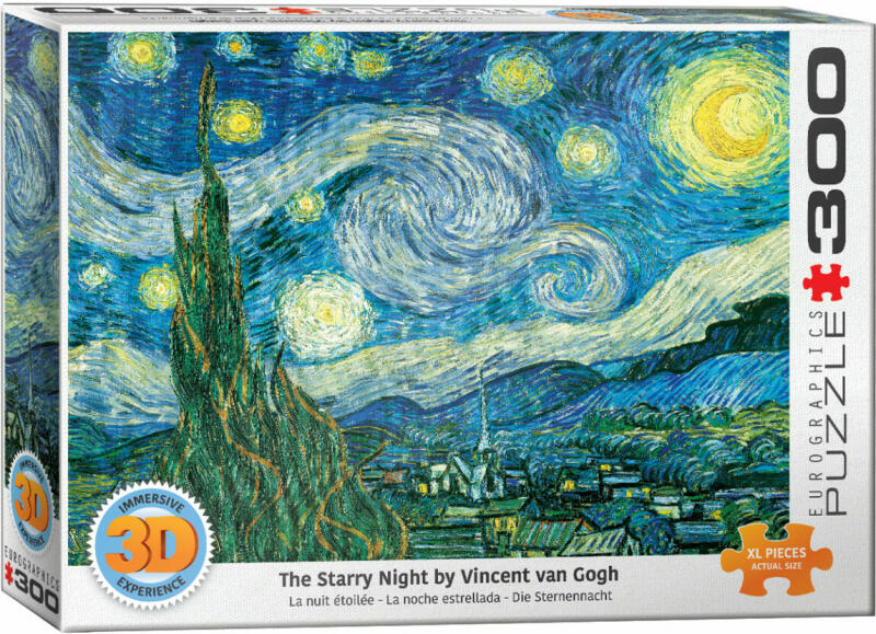 EuroGraphics teljesen új módon alakította ki a legújabb kirakóit. A  3D optikai hatású puzzle , amely a mélység benyomását kelti,  ha különböző szögekből nézik őket, egyesek 3D hatást fejtenek ki. Vessen el Vincent van Gogh elbűvölő világában az Eurographs Starry Night 3D Lenticular puzzle-jával.   Ez a 300 darabból álló kirakós, az ikonikus műalkotás lenyűgöző megjelenítését mutatja be, és élénk részletekkel kelti életre a képet.