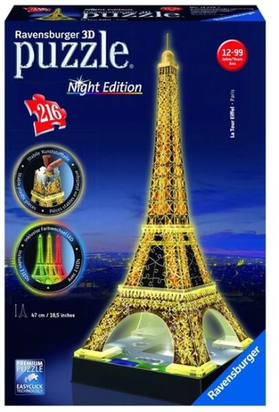 Ravensburger Eiffel-torony 216 darabos 3D puzzle fénnyelPárizs legismertebb épülete, LED világítással, mozaikdarabokból A Ravensburger Eiffel-torony 216 darabos 3D puzzle fénnyel az 1889-es világkiállításra készült hatalmas épület, amit puzzle elemekből tudsz összeállítani. A mozaikdarabok könnyen és pontosan csatlakoznak egymáshoz, az alapzat LED fénnyel van felszerelve, ami akár több, váltakozó színekkel is képes világítani. A játék 3 darab AAA mikro ceruzaelemmel működik, a csomagolás az elemeket nem tartalmazza. Az Eiffel-torony 216 darabos 3D puzzle fénnyel összerakott magassága 47 cm, az alap méretei 18 X18 cm.