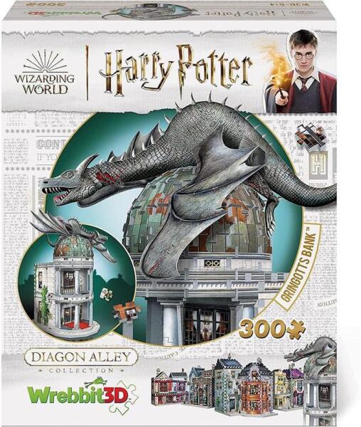 A Wrebbit 300 db-os 3D puzzle - Harry Potter - Gringotts Bank kirakó a népszerű Harry Potter filmek egyik fontos épületét, a varázslók egyetlen bankját, a Gringotts-ot ábrázolja.  Az Abszol úton található, impozáns fehér épületet egy félelmetes sárkány őrzi. A puzzle darabok könnyedén illeszkednek egymáshoz, az összeállításhoz pedig egy rajzos ábra lesz a segítségedre.